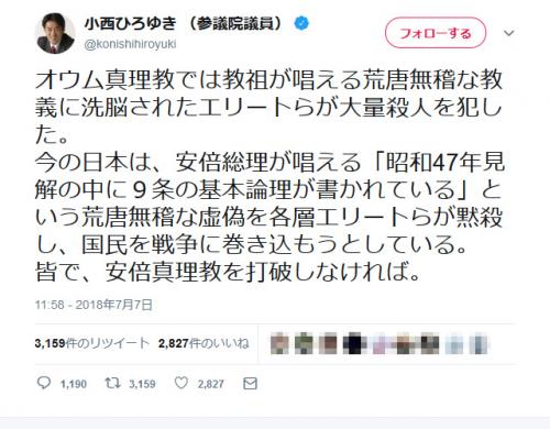 オウム死刑執行を利用して 安倍真理教を打破 と不謹慎発言の小西ひろゆき議員に批判殺到 以下略ちゃんの逆襲 ツイッターgogo