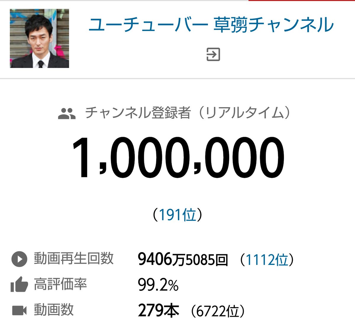 江頭2 50のyoutubeチャンネルが嵐に次ぐ早さで登録者数100万人突破する伝説達成 同日に草彅剛さんも100万人突破する奇跡も togetter
