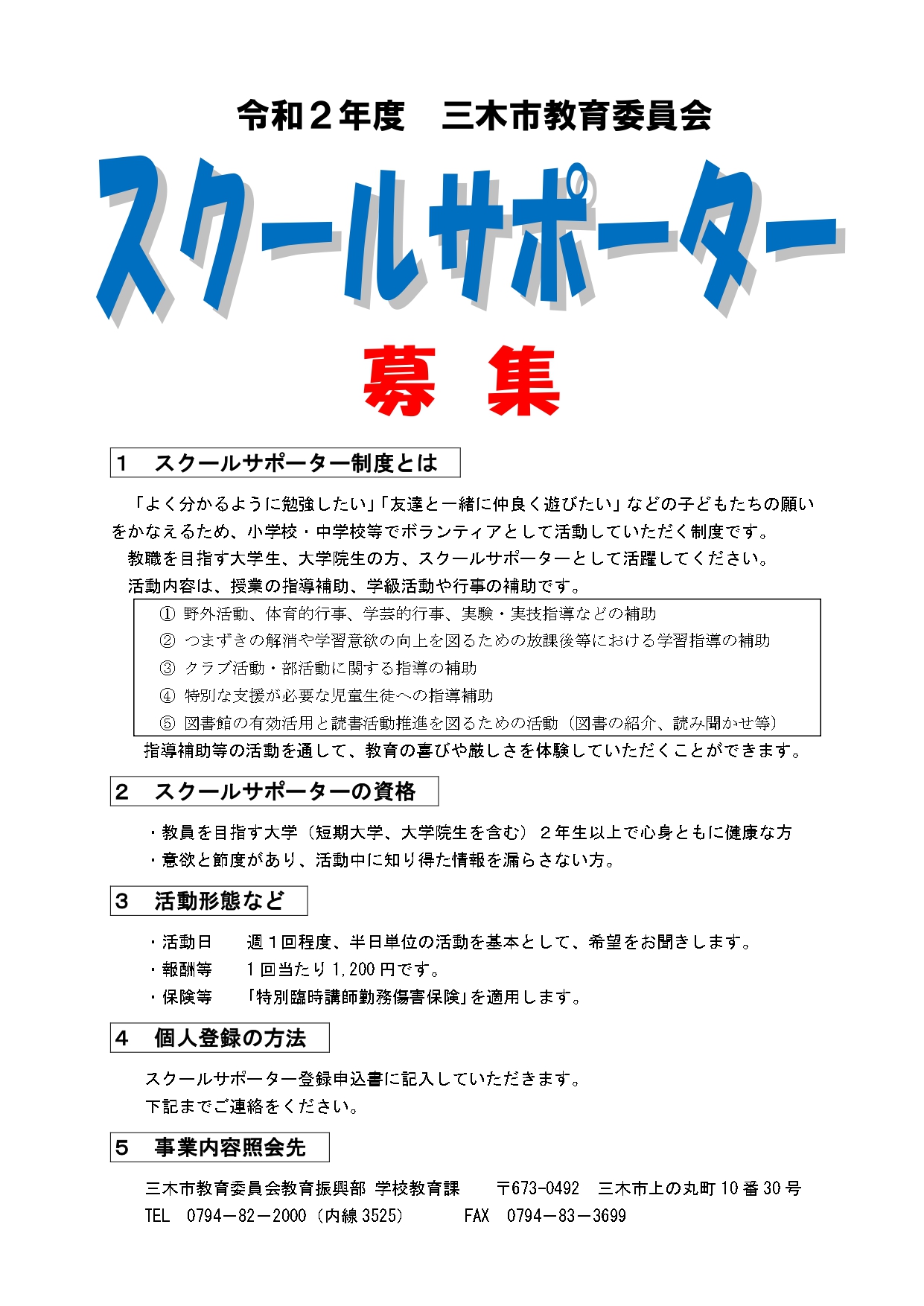 兵庫教育大学ボランティアステーション on twitter 三木市教育委員会から スクール サポート スタッフ スクールサポーター 学部2年生から 募集の案内が届いたのでお知らせします チラシを見てね もちろん それ以外の市も引き続き募集しています