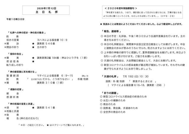 2020年7月12日 日 日曜礼拝 主の祈り 2 だから こう祈りなさい つくば市のプロテスタント教会