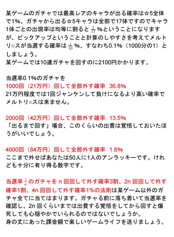 ガチャを回す時の当選率のわかりやすい表と解説が話題に 注意事項に貼るべき 出るまで回せば100 togetter
