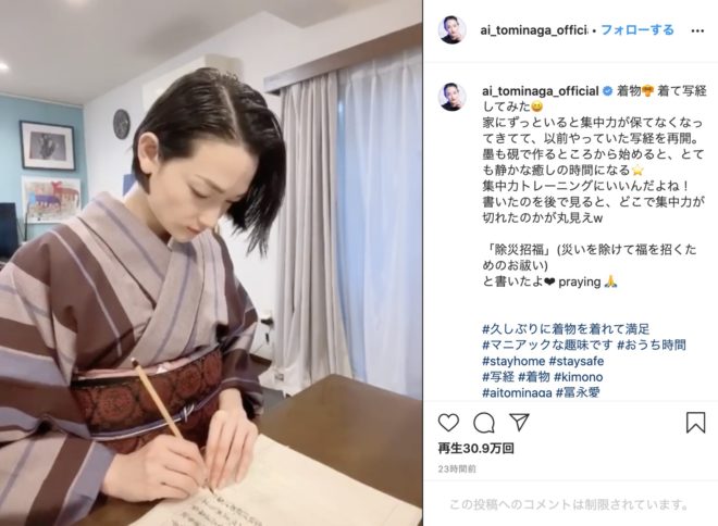 ずっと見てられる お美しい モデルの冨永愛さんが着物で写経する様子を動画で公開