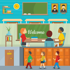 有站立在教室水平的横幅的委员会前面的学生的学校教训女老师向量例证 插画包括有 110174619