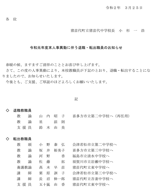 令和元年度末人事異動について 3月 2020年 引佐南部中学校 ブログ 引佐南部中学校
