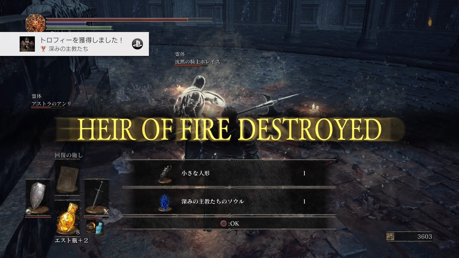 深みの聖堂でアノ人に 白霊アストラのアンリ 沈黙の騎士ホレイスとボス深みの主教たちへ 闇霊中指のカーク そしてパッチさん ファランの種火 傭兵の双刀 防具 金鷲の小盾 大沼の指輪 ロイドの剣の指輪 トゲの直剣 盾 大主教装備セット入手 ダークソウル3