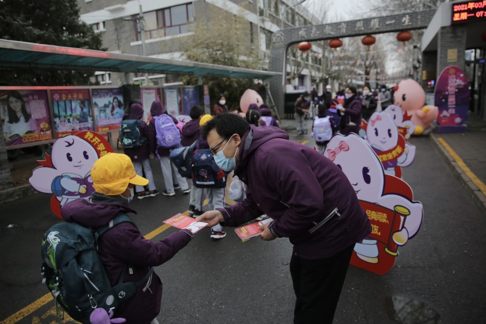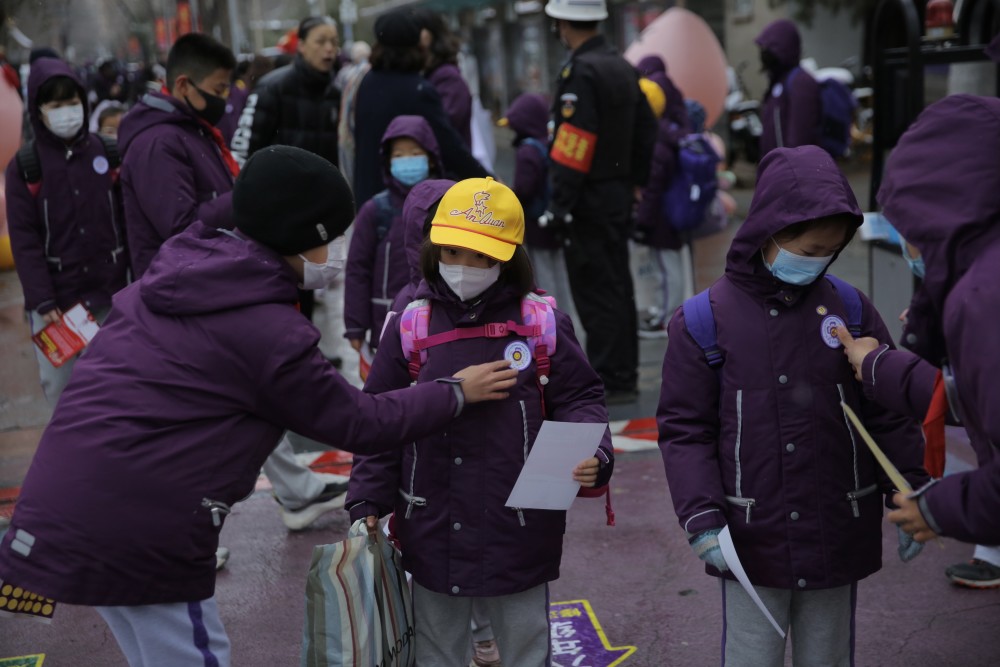 清华附小 福牛吉祥物在校门口迎接学生们返校 中国教育学堂