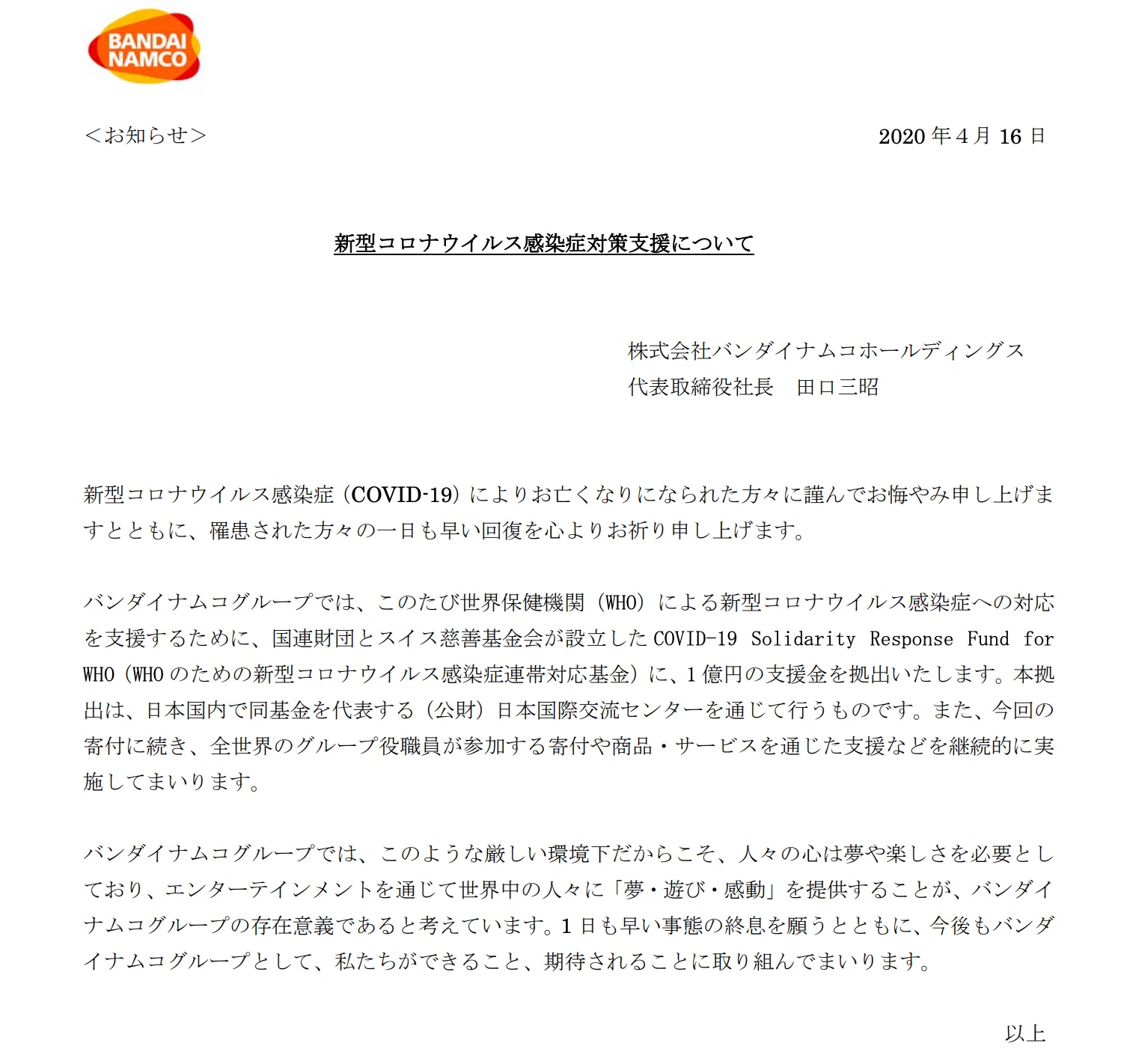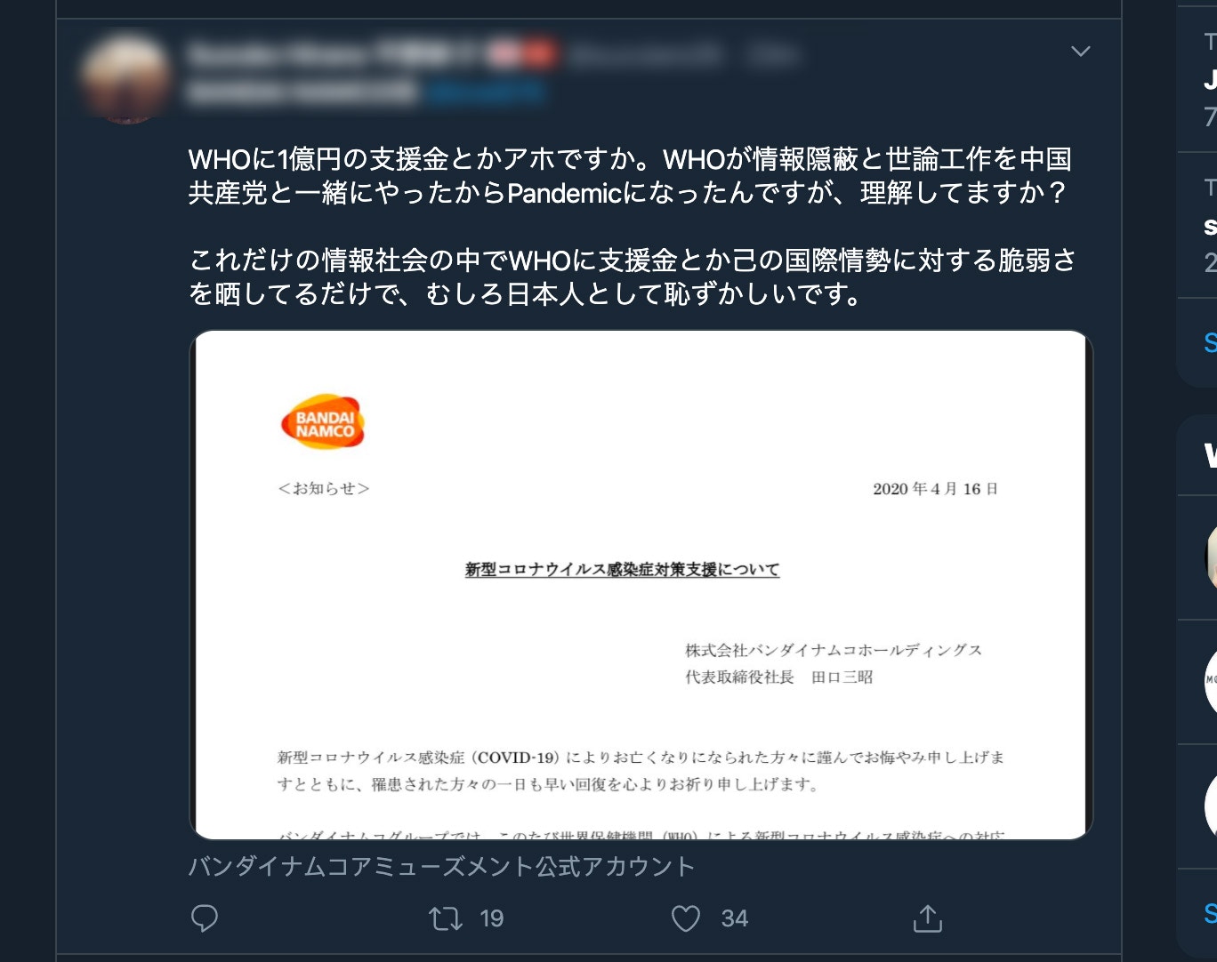 新冠肺炎 bandai namco 捐出一億日圓予who 反惹網民圍攻